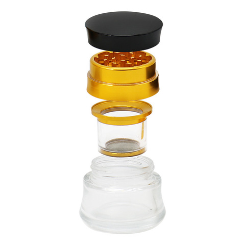 Molinillo de hierbas de vidrio y metal de 4 capas de diseño sencillo al por mayor, vidrio en forma de cintura para tanque, herramienta de molienda de especias de tabaco seco con logotipo personalizado